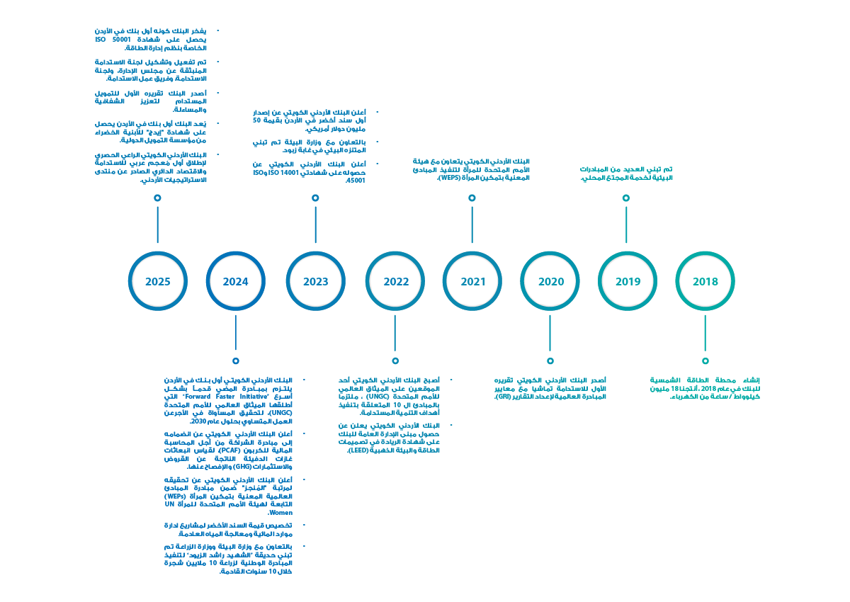 يوضح الإطار الزمني مسيرة وإنجازات البنك الأردني الكويتي في مجال الاستدامة منذ عام 2018 إلى عام 2024، ويعكس التزام البنك الراسخ بالمسؤولية البيئية والاجتماعية، وسعيه الدائم لإحداث أثر إيجابي من خلال المبادرات والشراكات المستدامة المبتكرة.